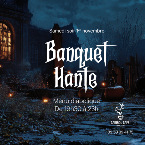 Banquet Hanté - Une soirée effrayante au Caribou Café Le 1er novembre de 19h30 à 23h, plongez dans une soirée unique avec un Banquet Hanté au Caribou Café ! Un menu diabolique et une ambiance lugubre pour un dîner inoubliable.