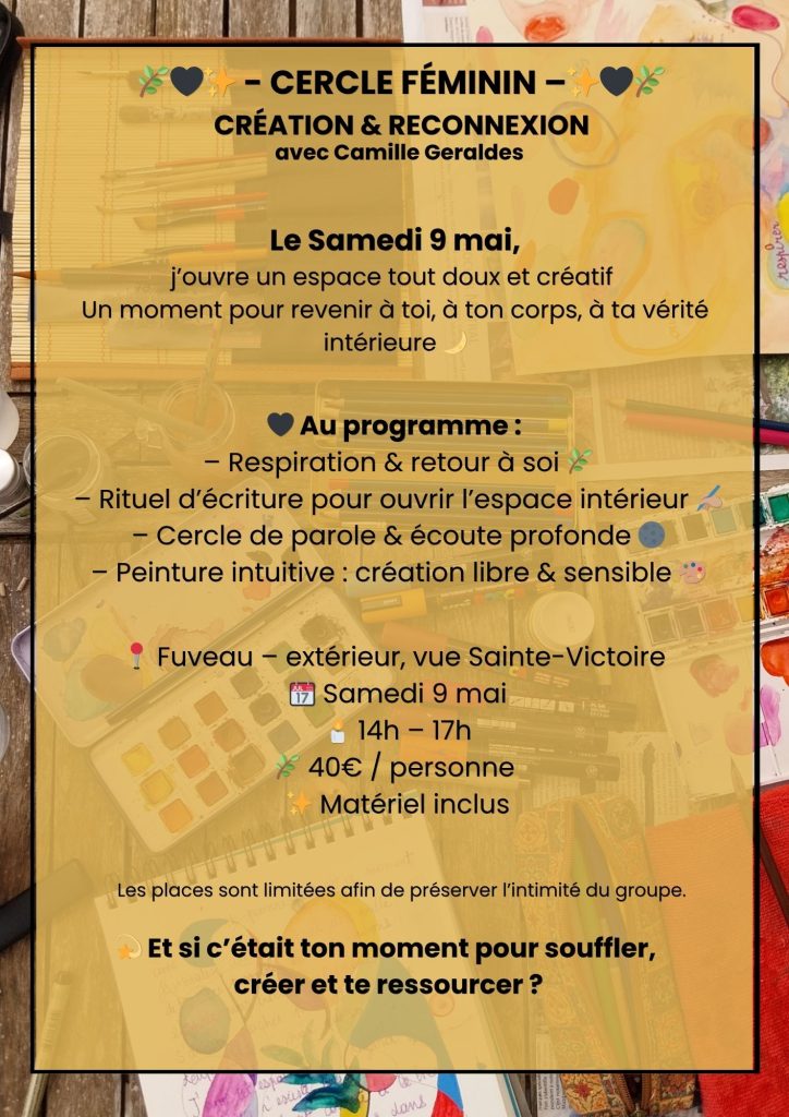 Ce cercle féminin est une invitation à la création et à la reconnexion avec soi-même, animé par Camille Geraldes. Il offre un moment privilégié pour se recentrer, explorer sa vérité intérieure et s'exprimer librement. Les activités incluent des exercices de respiration, un rituel d'écriture pour libérer l'espace intérieur, un cercle de parole pour favoriser l'écoute et le partage, ainsi qu'une session de peinture intuitive pour une création libre et sensible. L'événement se déroule en extérieur à Fuveau, avec une vue sur la Sainte-Victoire, et le matériel est inclus. Les places sont limitées pour garantir l'intimité du groupe.