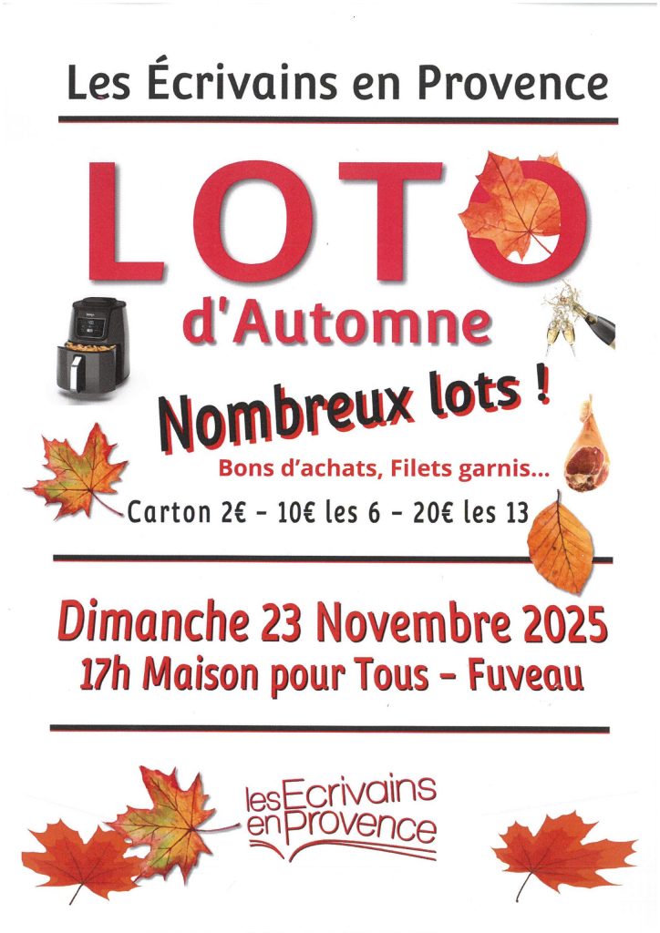 Participez au super loto organisé par les Ecrivains en Provence à la Maison Pour Tous ! Venez tenter votre chance dans une ambiance conviviale et repartez peut-être avec de beaux lots. Un moment festif à partager en famille ou entre amis !