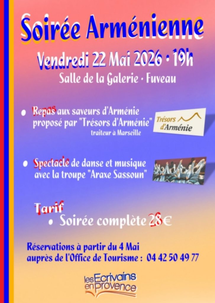 Une soirée arménienne avec un repas aux saveurs d'Arménie" et un spectacle de la troupe "Araxe Sassoun" avec ses danseurs et ses musiciens.