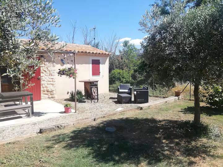 Petit extérieur clos avec table de jardin et barbecue, cadre agréable en campagne.