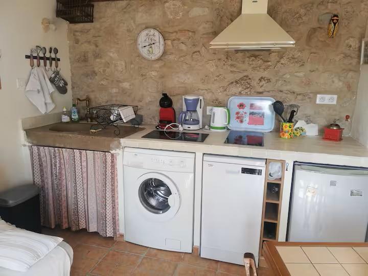 1 chambre (lit 140), salle de bain parentale, wc, cuisine équipée avec lave vaisselle, lave linge, frigo, cafetière dolce gusto et filtre