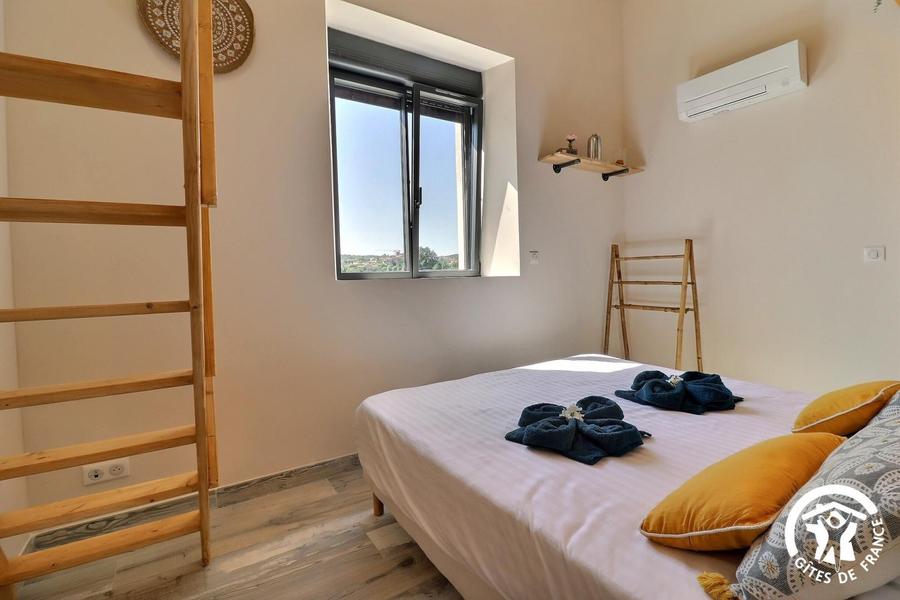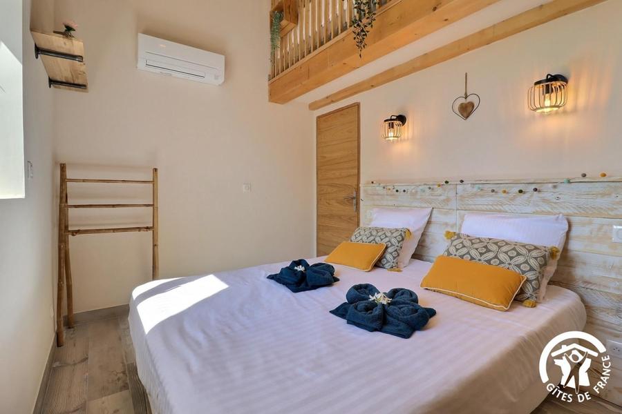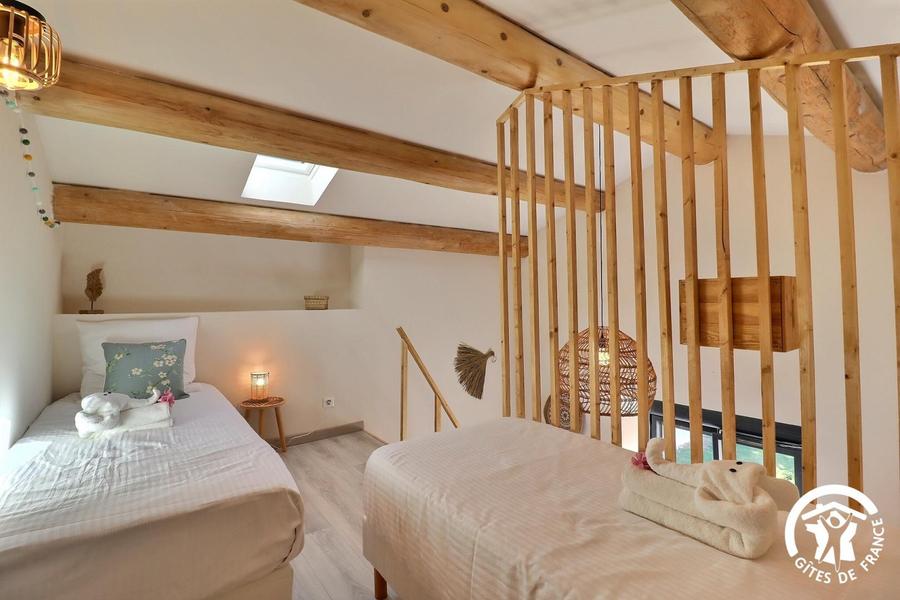 - une première chambre pour 4 personnes avec une grande hauteur sous plafond : 2 lits 80x200cm jumelables, placard rangement, mezzanine avec 2 lits simples 80x200cm. Salle d'eau privative avec WC.