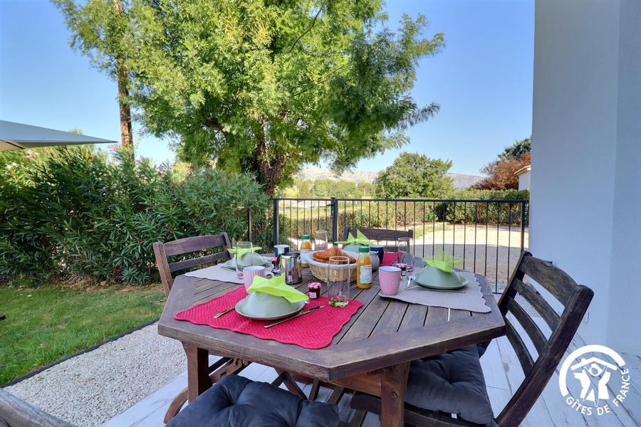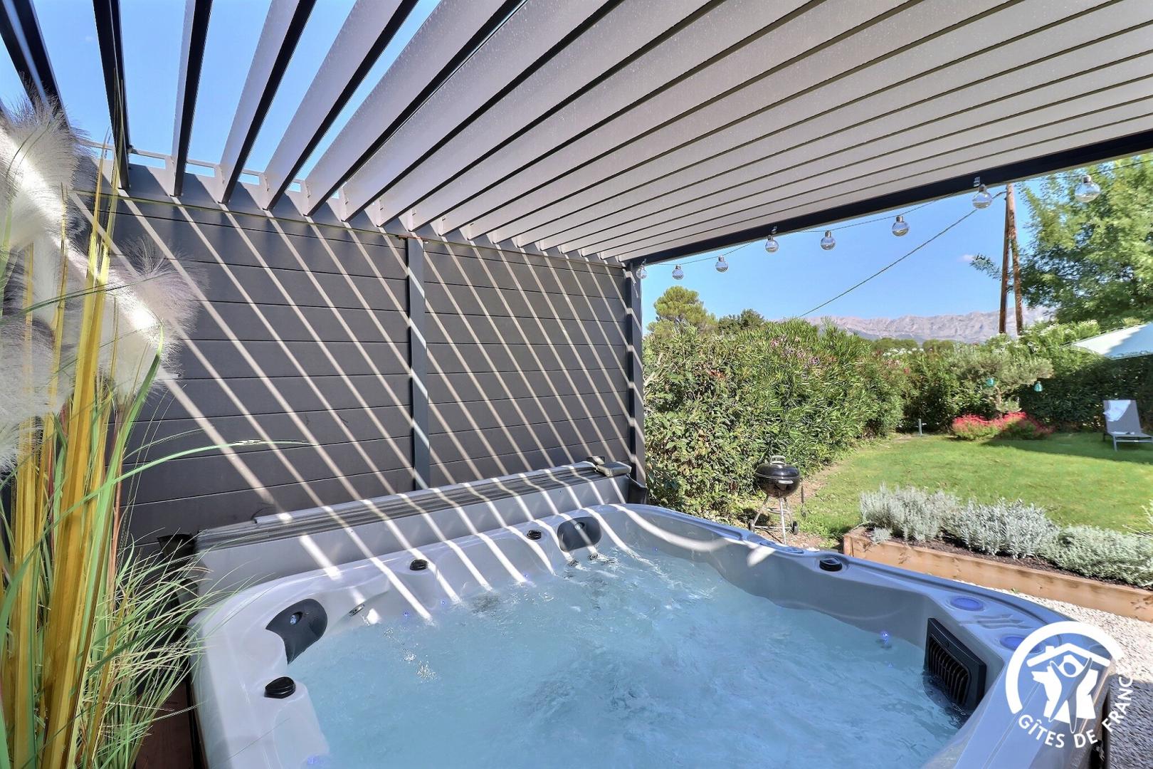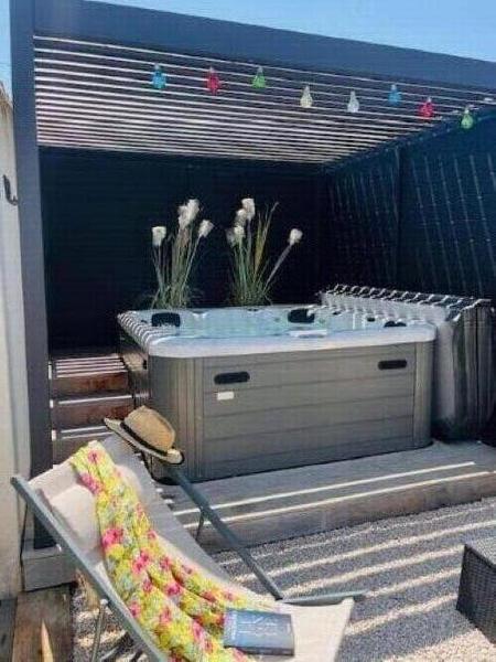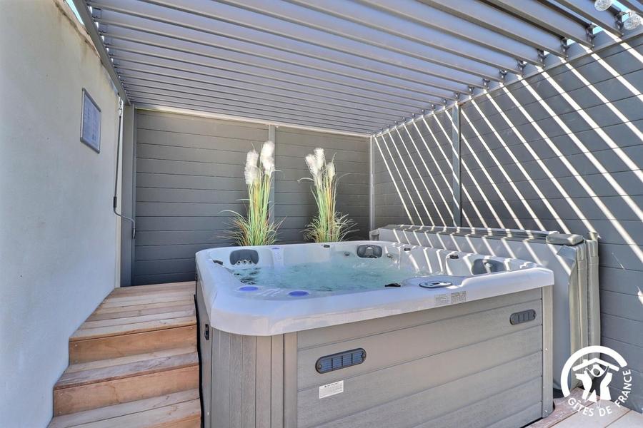 Mitoyen à la maison des propriétaires mais sans vis-à-vis, le gîte dispose de 3 places de parking privatives, d'un jardin clôturé de 200m² gazonné et arboré avec bains de soleil, d'une terrasse avec salon de jardin, d'un espace jacuzzi abrité horaires ouvertures suivant saison et d'une douche extérieure.