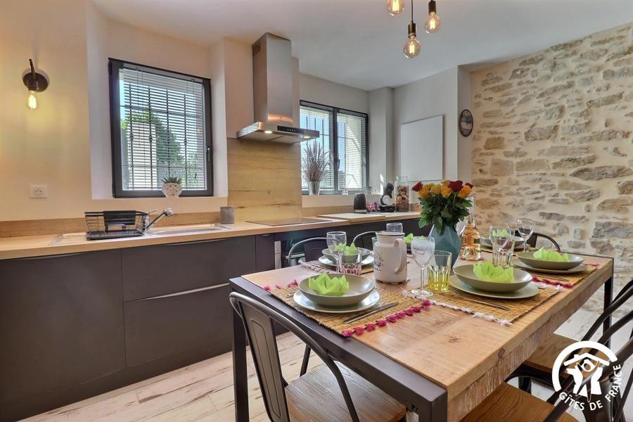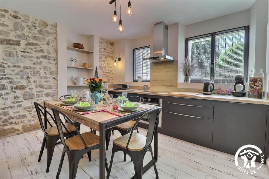- d'une cuisine accessible par 4 marches : équipée avec lave-vaisselle, four, micro-ondes, 3 feux induction, hotte aspirante, lave-linge, réfrigérateur, congélateur, table avec 6 chaises.