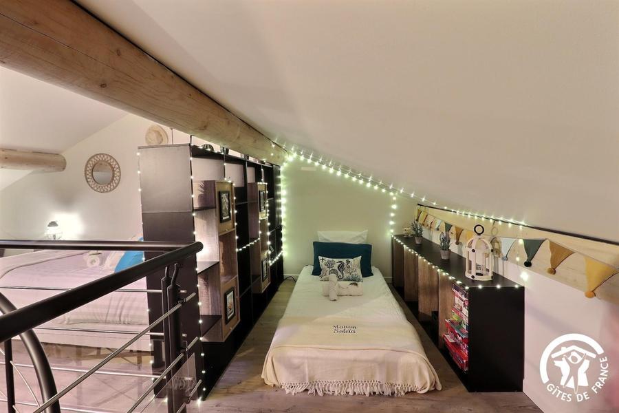 - Une grande chambre mansardée avec deux lits 80x200 jumelables, un dressing, un lit 90x200 sur un sommier bas