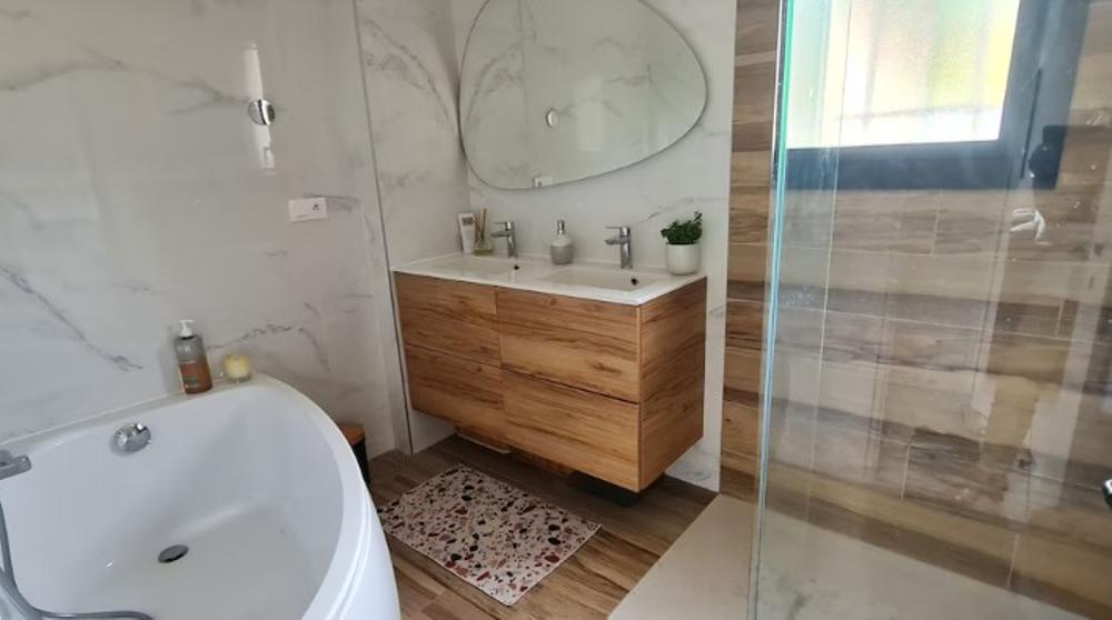1 salle de bain avec une baignoire et une douche. Un WC indépendant. Et à l'étage une salle d'eau avec une douche et un WC.