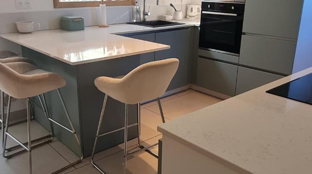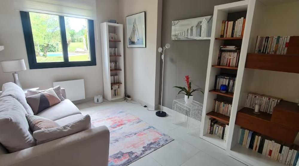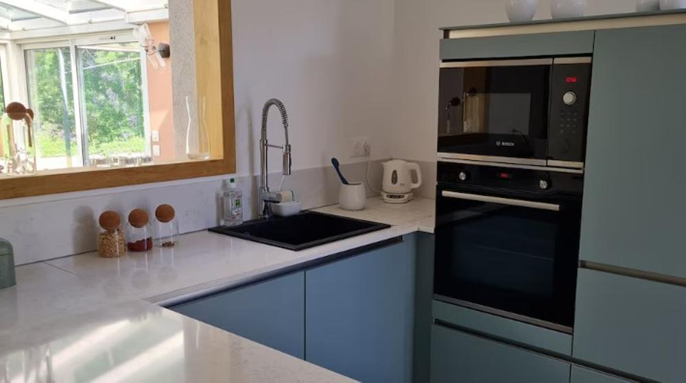 La maison est composée d'un grand salon, salle à manger, d'une cuisine équipée avec un lave vaisselle, un four et un four micro-onde, une plaque à induction, une cafetière l'OR barista à dosettes, un grille toasts, une bouilloire et tout le nécessaire pour cuisiner si le coeur vous en dit.