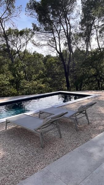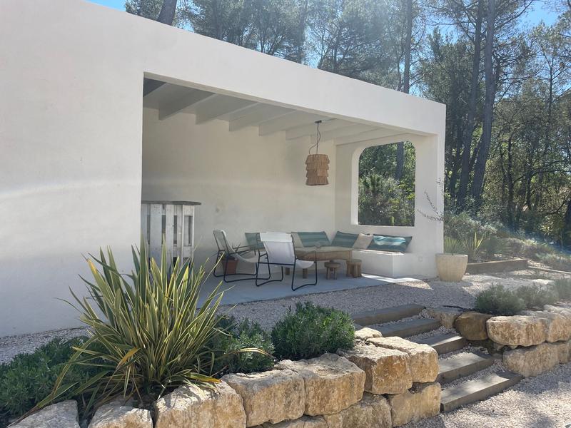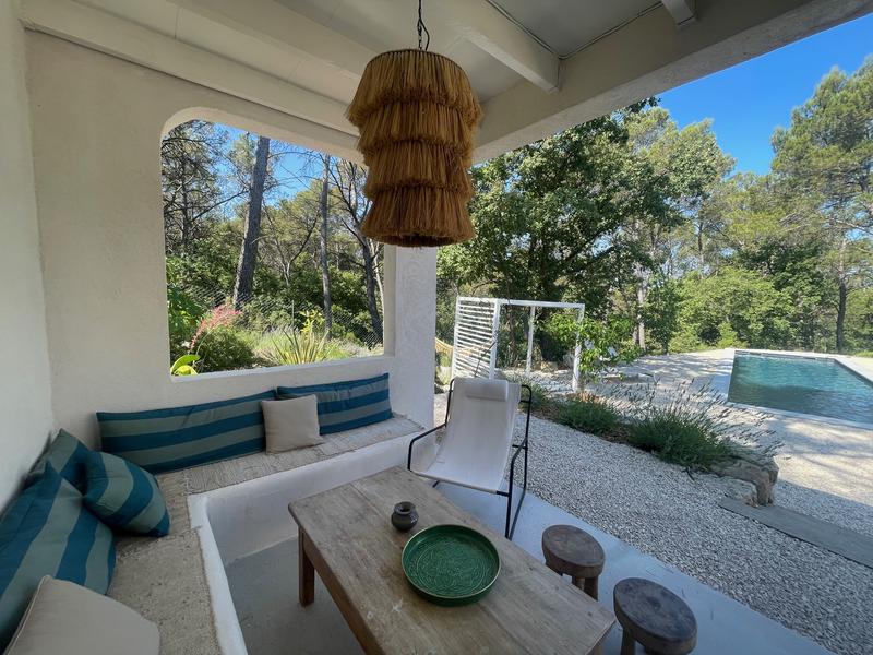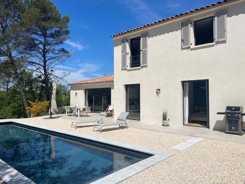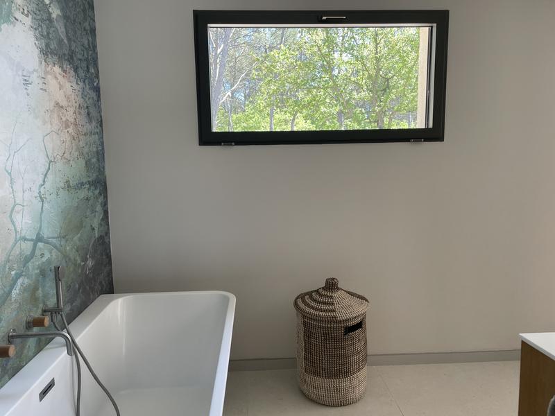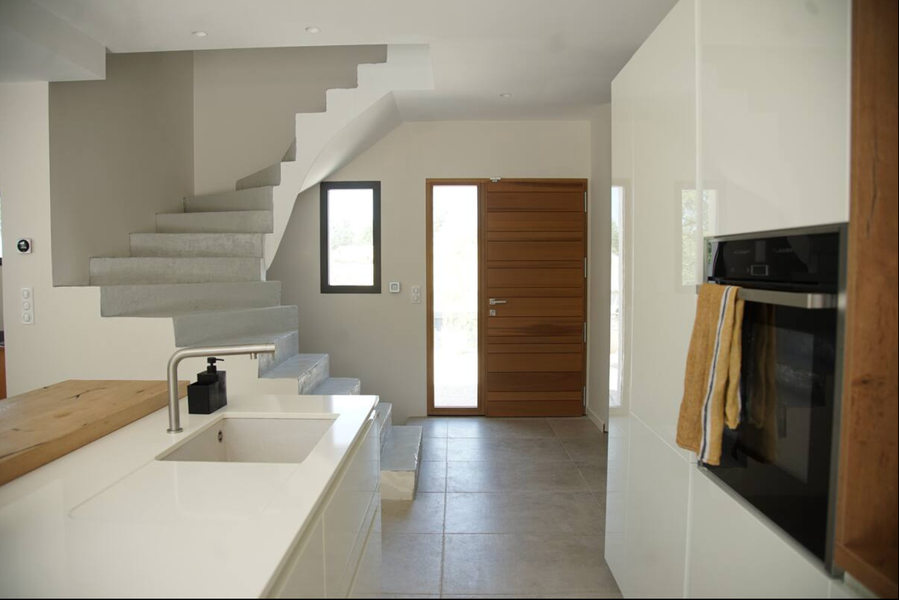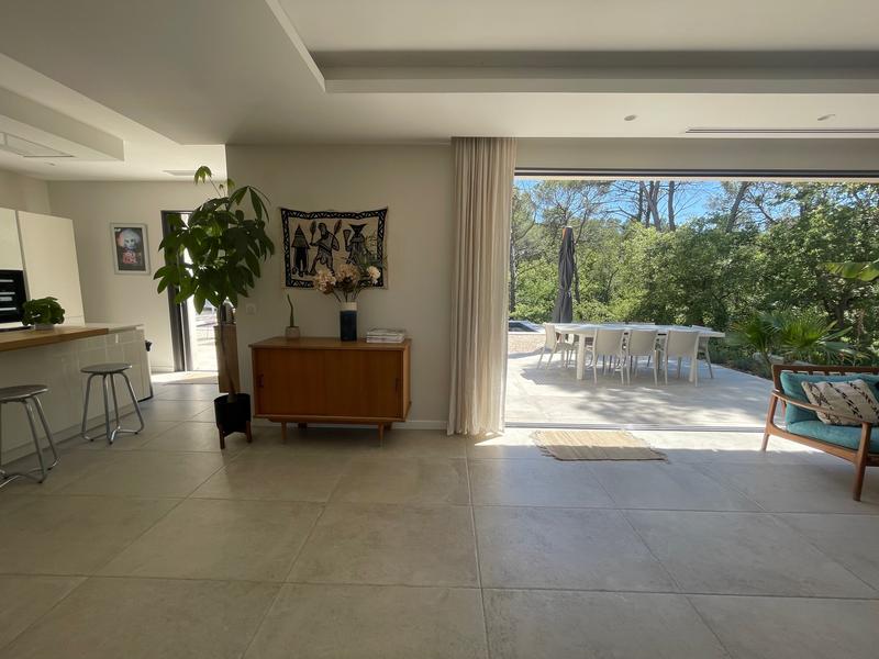 Grandes baies vitrées à galandage (volets roulants à part salon et bureau). 4 mètres d'ouverture dans le salon. Villa climatisé (clim reversible air-air).